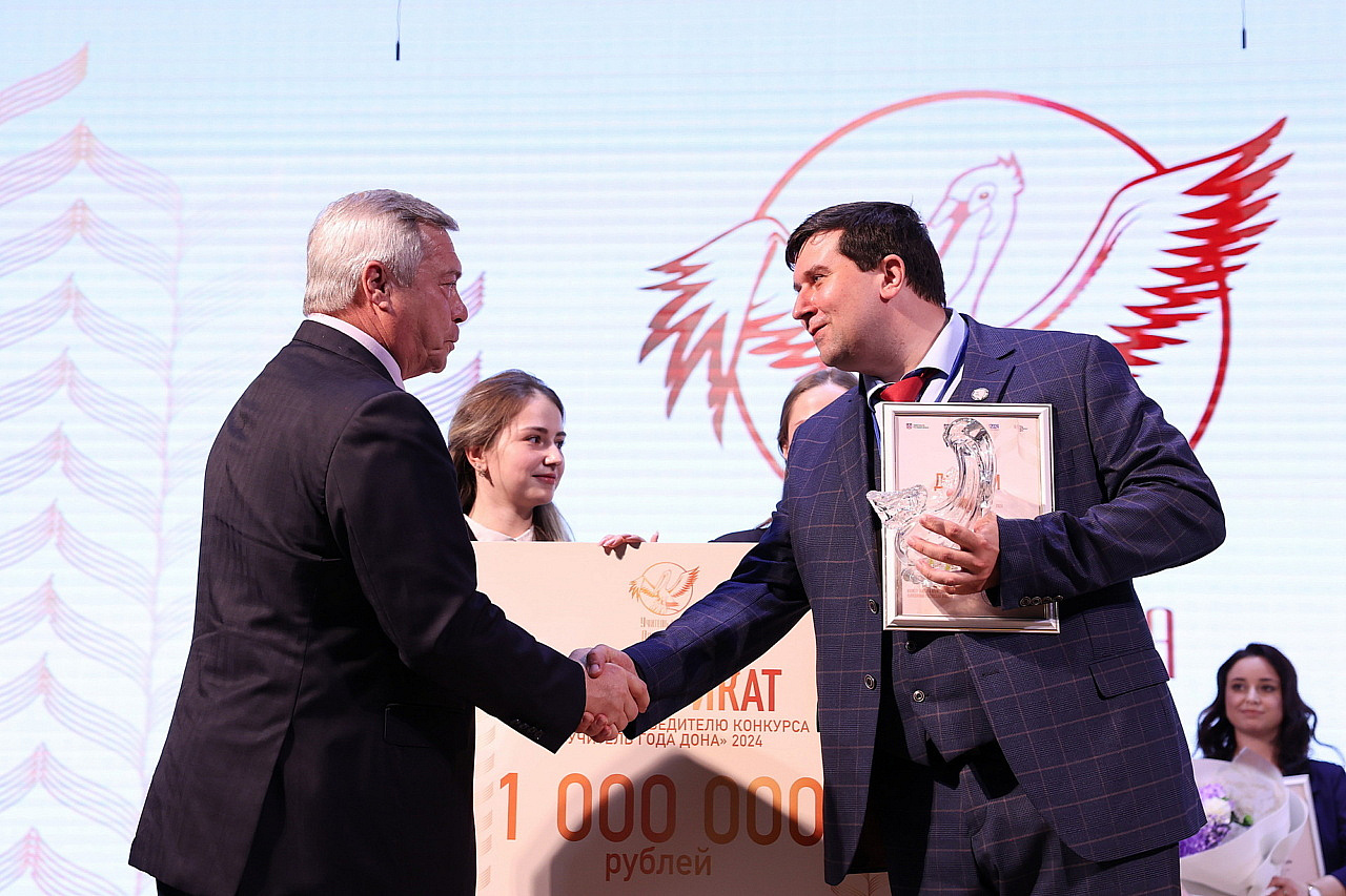 Сегодня в торжественной церемонии закрытия регионального финала конкурса принял участие губернатор Василий Голубев. Он и назвал имя абсолютного победителя - учителя математики школы №4 Батайска Владимира Абрамова. Он и будет представлять Ростовскую область на федеральном уровне. Надеемся, что в октябре этого года Владимир выйдет на сцену в числе финалистов.