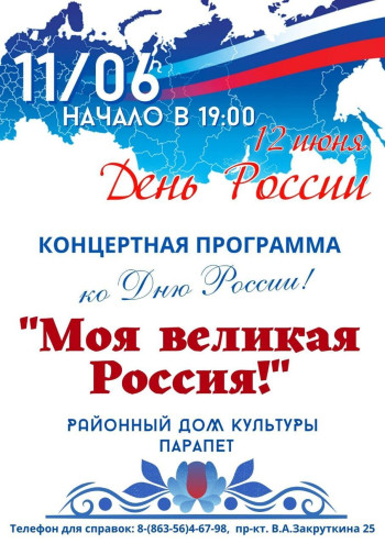Уважаемые жители Семикаракорского района! Приглашаем вас на концертную программу ко Дню России «Моя великая Россия!»,