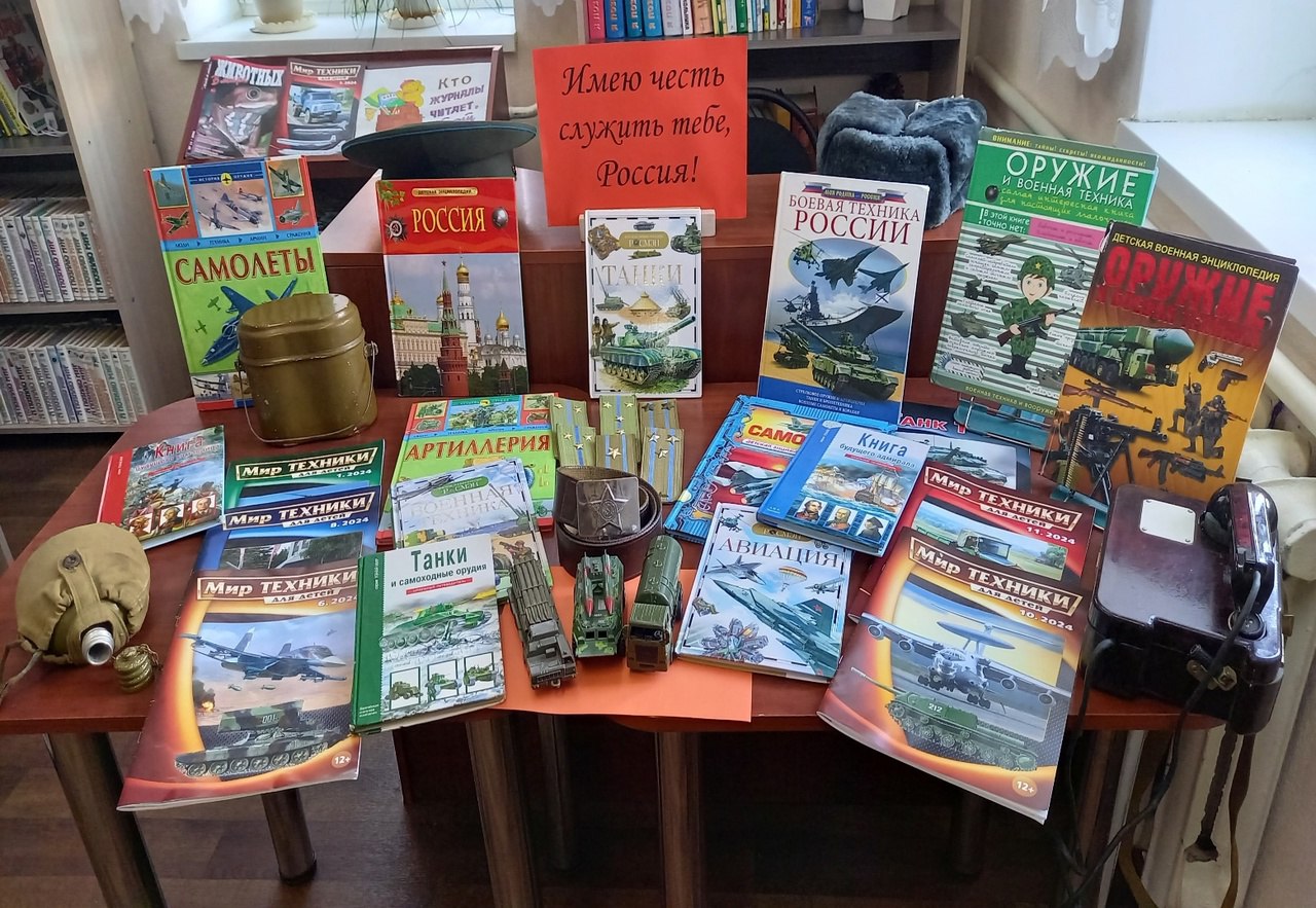 В Детской библиотеке МАУК МГП "Центр культуры и досуга" оформлена выставка - экспозиция "Имею честь служить тебе, Россия", посвященная году Защитника Отечества.